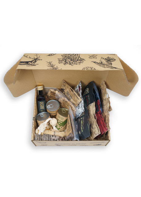 Pełen smakołyków „Dziki Kuferek”. Bażant, jeleń, dzika kaczka, dzik, zając – to wszystko znajduje się w tym zacnym, pięknie zapakowanym zestawie. Idealna rzecz na prezent!