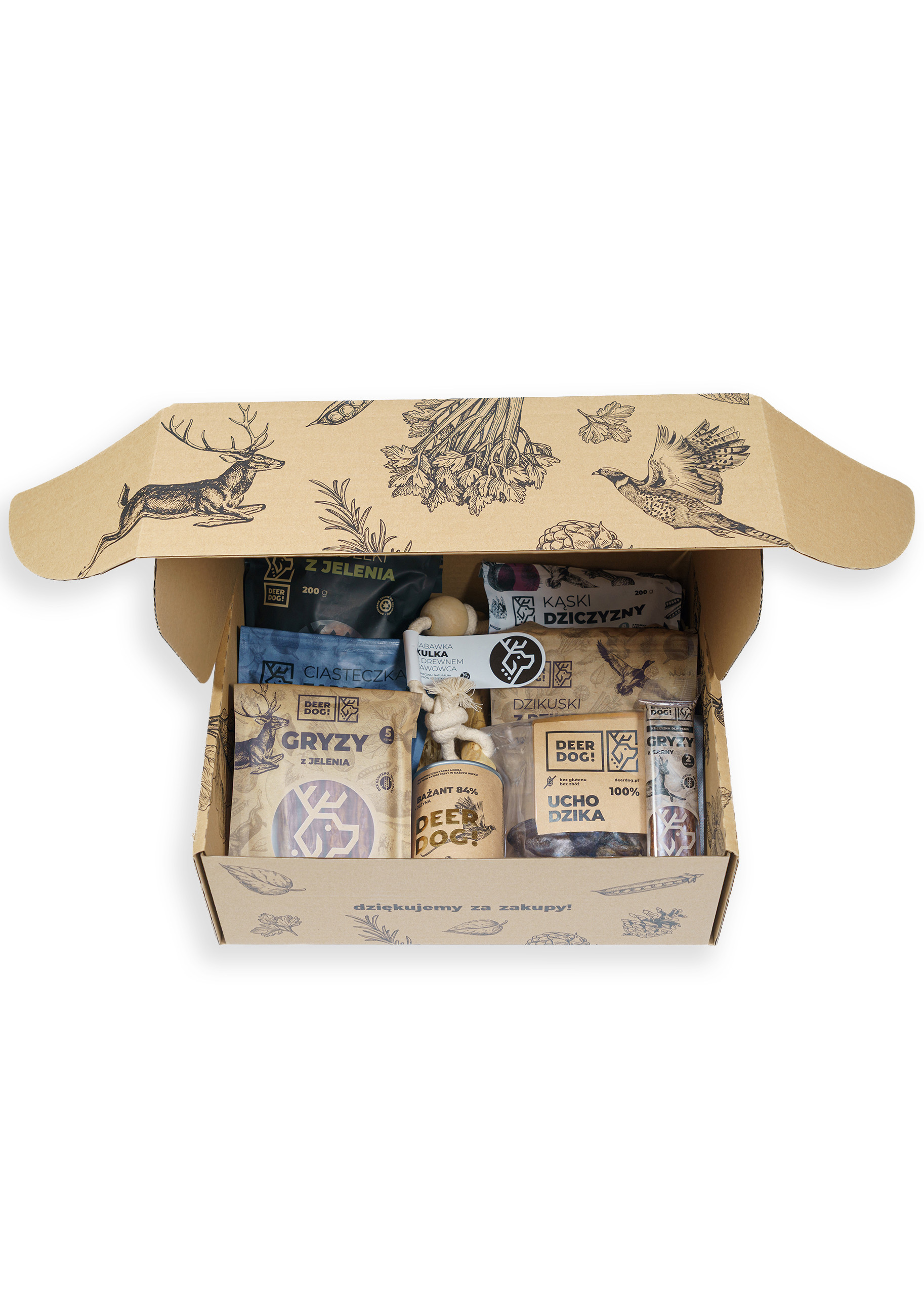 Oto "Dziki Kuferek" - zestaw upominków dla psa. Potrzebujesz prezentu dla psa? Jest i ON - "Dziki Kuferek" pełen smakołyków, pocieszaczy, poprawiaczy humoru. W kuferku upchnęliśmy mnóstwo pyszności. Są i serdelki, i kąski, i dzikuski, i ciasteczka. A wszystko pięknie zapakowane. Nie musisz szukać, nie musisz składać zestawu. Po prostu - wybierz "Dziki Kuferek" i spraw przyjemność pupilowi!